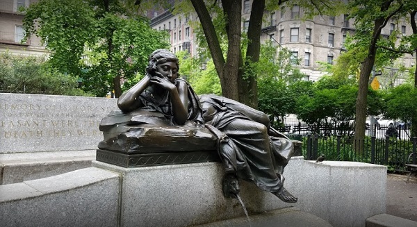 Straus Park—a very small wedge of territory—is filled with greenery. In the midst of this curated forest are a small, jewel-box garden, a bubbling fountain that doubles as a de-facto birdbath, and center-stage, a wonderful bronze statue of a beautiful young woman in repose, lost in a state of eternal reflection.