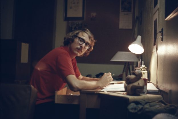 David dipped under the table and pulled out his laptop and brought up a roll of photos clearly from the 70s. Friends hugging in college dorms. Guys in clown makeup. A guy with a black eye. Crowds storming a football field.