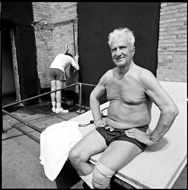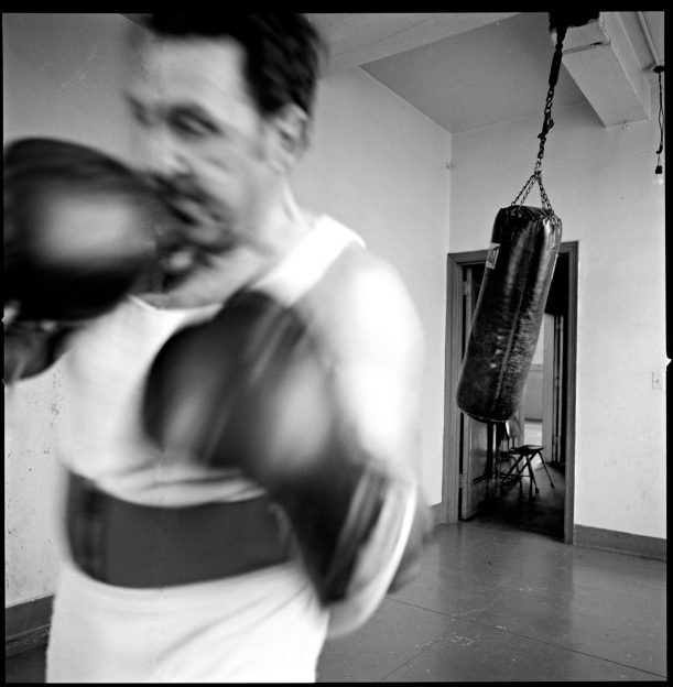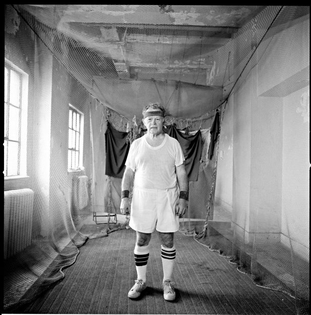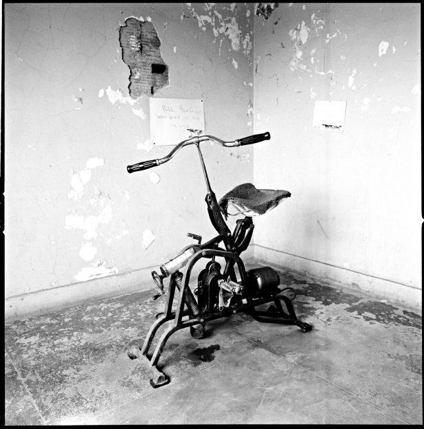 During my time as a member, I began making a series of photographs. In addition to some interesting members, there were strange little rooms throughout the club. One had a large body bag for boxing, another nets for golf, another an ancient exercise bike. There was a very funky weight room: all the weights under 40 pounds were stolen and replaced by coffee cans filled with cement joined by a piece of pipe.