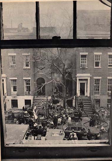 Precisely at noon, she had picked Ethan up at school, and was walking south on Fifth Avenue with the other children and mothers. As they reached the corner of 11th Street, there was a deafening blast, followed by a billowing cloud of black smoke, and—as soon as they could see through the smoke—flames leaping from a house on the south side of the street. "My God, it’s my house," said Ann, and leaving our son with a friend on the corner, she ran toward the house. As she approached, she saw that the flames were coming out of the windows of Number 18. She ran into the building on the corner and telephoned me. Then she went back toward Fifth Avenue, which was shrouded with dense black smoke three blocks south to Washington Square.