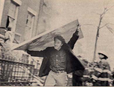 Our upstairs neighbors brought an assortment of packing boxes, which we shared. All of the tenants, each with a legion of friends, stood lined on the sidewalk. I found a brown paper bag and on the back of it scribbled the few most essential items in the house and read them off like battle assignments. At a nod from the fire marshal, and as the sightseers watched, we each grabbed a box and flew upstairs. It looked, for all the world, like a supermarket sweepstakes. How much could we squeeze into our shopping carts? How many trips could you make in ten minutes? Once inside, everyone forgot my instructions and grabbed whatever was nearest or dearest to his heart. My sister-in-law lifted an unwieldy sliding oak cabinet, and hugging it like a baby, carried it downstairs. One male friend darted into our kitchen and snatched a toaster (but apparently not the mouse who had been cozily living in it before the explosion) and an electric mixer. Ann and I were mostly interested in saving Ethan’s books and toys. We looked like Santa as we bounced down the stairs.