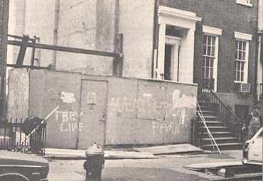 Recently I wandered over to 11th Street. Numbers 16 and 20 looked clean and fully rented. Their sides were freshly plastered. The black hanging bookcase had been removed. But Number 18 was still a gaping wound on the street. The fence in front of the lot was filled with graffiti, some as old as last March, some fairly recent. One was altered since it first made its appearance. In answer to the slogan, Nothing Is Free, someone wrote, "Everything Is Free," which had been changed to "Everything is still Free Especially Death."