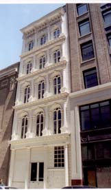 Of all of the remaining Bogardus buildings in Manhattan 75 Murray Street is by far the best restored. This is largely due to the diligence of the current owners, George and Christiane Aprile. Since buying the building in 1991, George Aprile has become something of a James Bogardus aficionado. Built in 1857 for merchants of fine table china and paint, 75 Murray Street resembles a late-fifteenth century Venetian palace. The building is three bays wide and sits on a 25-foot lot. Corinthian columns frame the windows and Medusa heads decorate the keystones on the third and fourth floors