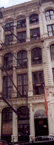 A tattered banner announcing RFR Textiles blows a little dejectedly outside 85 Leonard Street, a sad reminder that industry in this country has become more or less obsolete. One of the early supporters of cast-iron architecture, the textile industry embraced BogardusÕ own dream of inventing a building that was completely fireproof. This turned out not to be the case, for under extreme temperatures it becomes brittle. While 85 Leonard Street is badly in need of restoration, it is a beautiful example of the decorative possibilities presented by working in cast-iron. Leafy vines and bunches of grapes appear between the arched windows below the roof. The two sets of columns, rising up two stories, are designed in what is known as the sperm-candle style, because of the columns' resemblance to the tall delicate candles made with the oily wax from sperm whales. A Tiffany plaque by the loading dock reads: "James Bogardus, originator and patentee of iron buildings, Pat; May 7 1850."